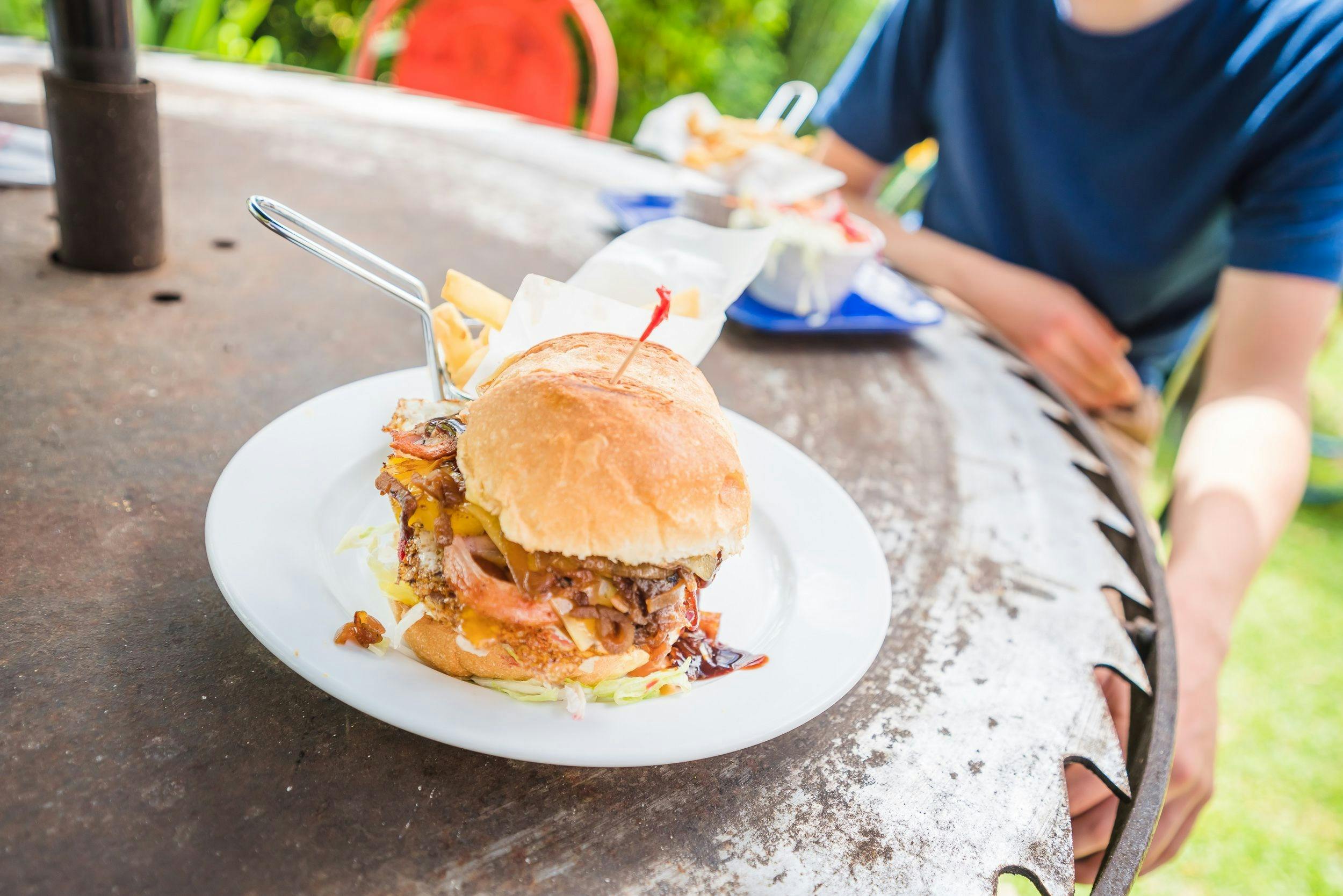 The main cafe area is the original hotel bar with memorabilia associated with motorcycles and a fabulous collection of vintage Fire Brigade Helmets. You can choose to dine either inside the café, on the verandah deck or alfresco under the magnificent willow tree surrounded by gardens and cleverly created sculptures. If it is a quick caffeine hit you need, then the Royal also offers to take away tea, coffee and delicious cakes, slices and biscuits.