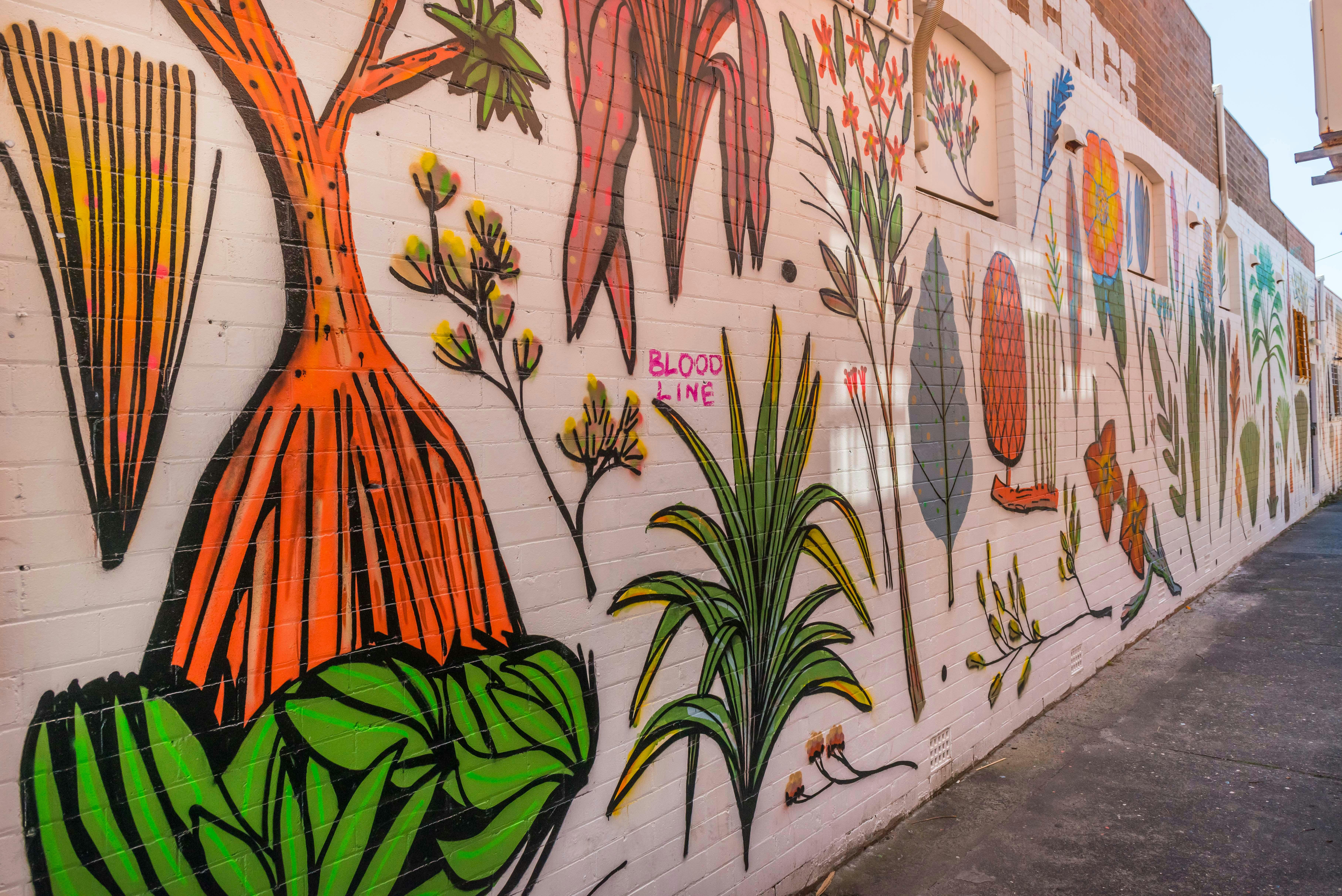 Brightening the laneway that links River Street and Winton Lane, Ballina Coastal Flora is a vibrant mural by Australian artist Tom Gerrard.