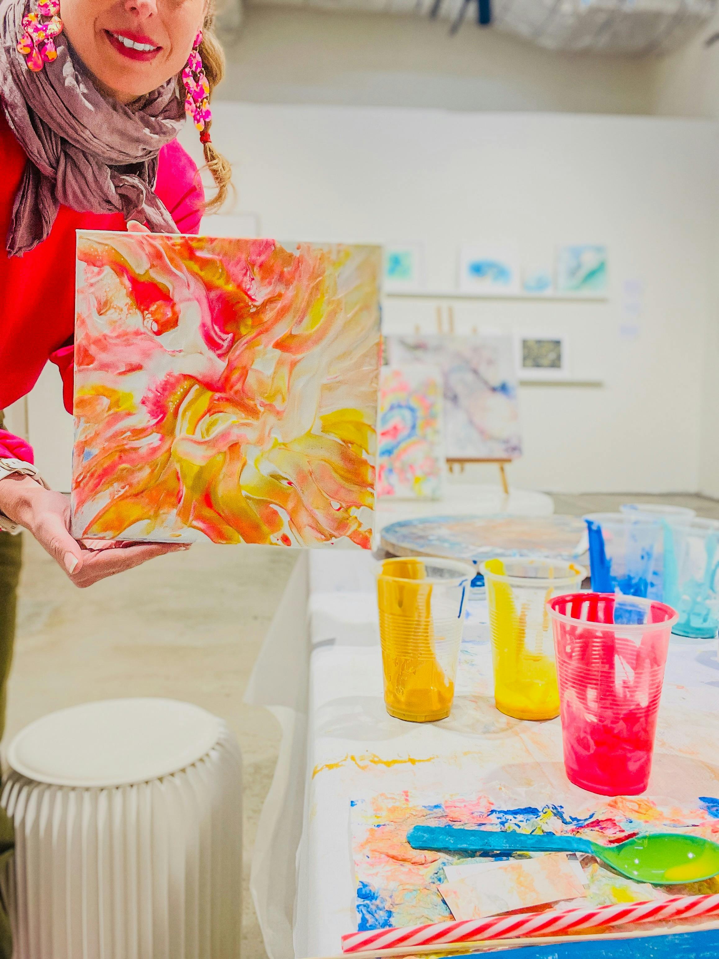 They use unique art methodologies - fluid art, during which you will use unusual art tools like straws, bamboo skewers, a lazy Susan, a napkin and a chef's torch - is the most popular tool; everyone is blown away by it!