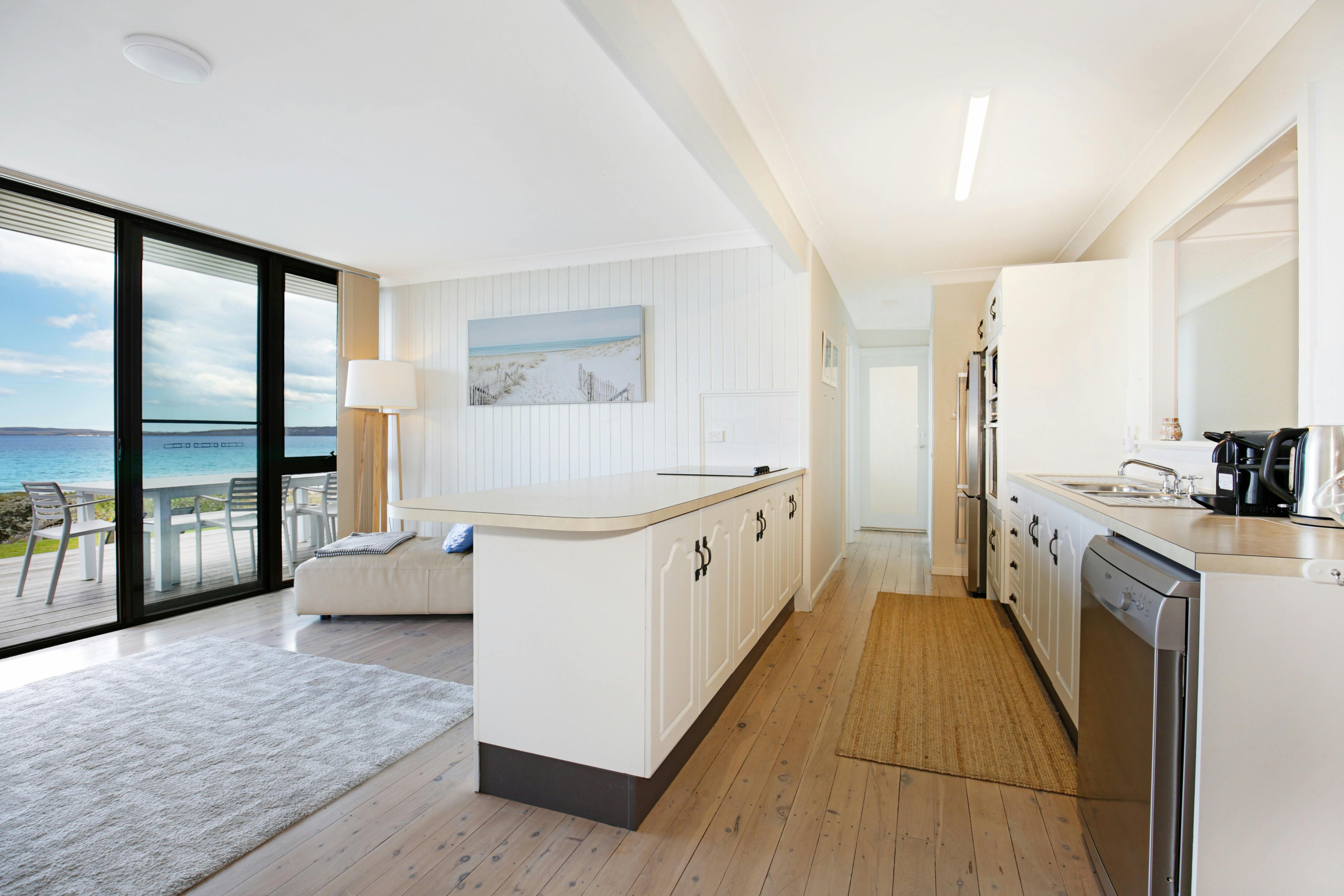 This beautifully renovated single level residence provides every comfort and convenience. With glass doors opening out to the deck, Azure is filled with light and fresh breezes sweeping off the ocean. With stunning views across Jervis Bay you can watch pods of dolphins swim past, relax and listen to the waves crash or maybe sip a glass of wine whilst you watch the sunset over the beach turn to the most magnificent display of the Milky Way you’ve ever seen. Your pets will love being off-leash on the beach after 4 pm.