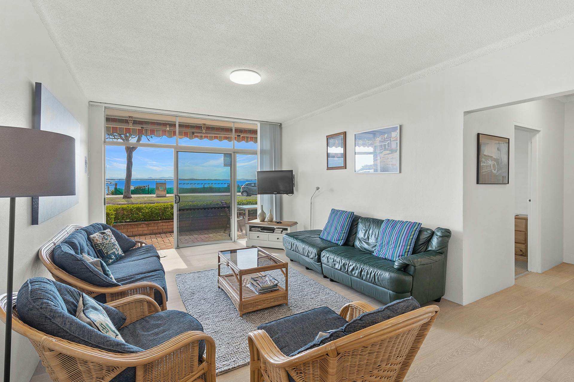 The three bedrooms all have ceiling fans, and the main bedroom has a queen bed, wardrobe and sliding door access out to the front courtyard area with fantastic northerly water views. The second bedroom offers a queen bed and water view, while the third bedroom offers two king single beds and a second television for the kids game consoles only. There are two bathrooms for your convenience, one with a bathtub, shower and toilet and the other with a shower and toilet.