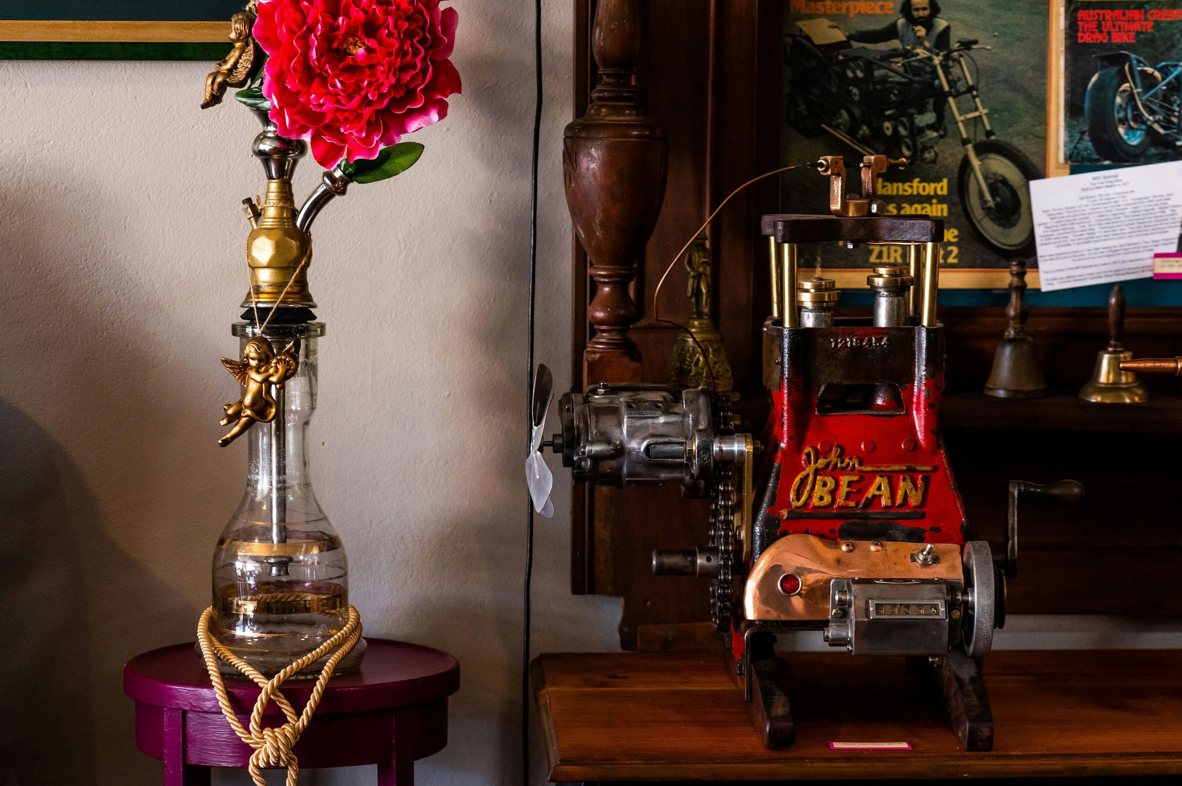 Set in a turn of the century scene this is an exhibition of handmade motorcycles, handmade engines by one artist. Mark Walker over 20 years plus his found object moving sculptures, very steampunk, also a studio of the creator of the space who is a metalsmith and local raku ceramics.