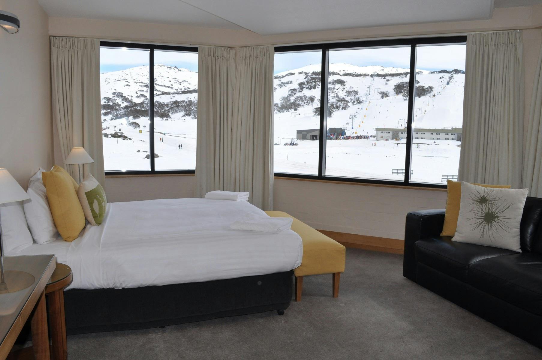 Large one-bedroom suites with enclosed balcony overlooking the Front Valley ski area which can accommodate up to four people. Room rates include two adults, breakfast, three-course dinner from an À la carte menu and complimentary over snow transport on arrival and departure plus daily complimentary transfers to the walking bridge during designated times. 250 metres from the chairlifts with incredible mountain views. Deluxe Suites have an ensuite, television, bar fridge, tea and coffee making facilities, wall heating, hairdryer and ironing facilities.