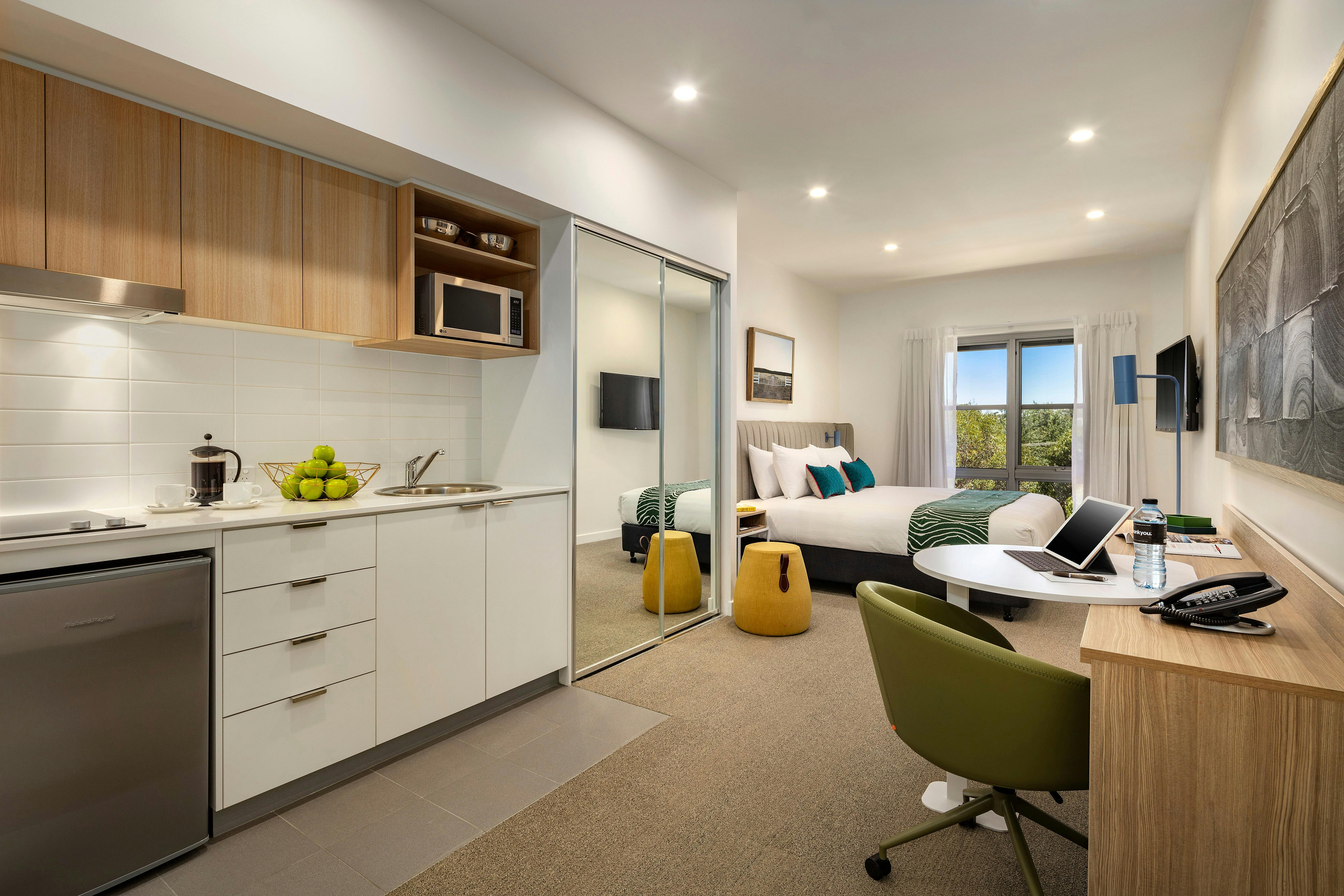 Quest Griffith has 68 serviced apartments including Studios, and One, Two and Three Bedroom apartments. Studios are the perfect alternative to a hotel room and have kitchenettes. The One, Two and Three Bedroom Apartments are ideal for families, colleagues or larger groups looking for a home away from home experience with full kitchens and laundry facilities.
