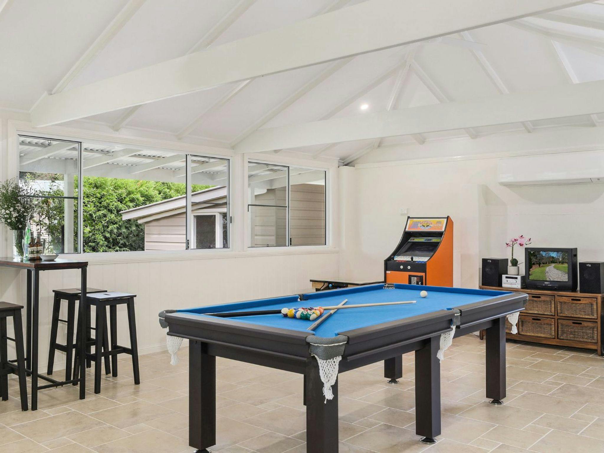 Step into the immaculately clean and beautifully styled interior, featuring an open wood fireplace, ducted central heating, and reverse cycle air conditioning to ensure your comfort in any season. Relax in front of smart TVs, challenge your companions in the games room equipped with arcade game machines and a pool table, or simply unwind with a selection of board games.