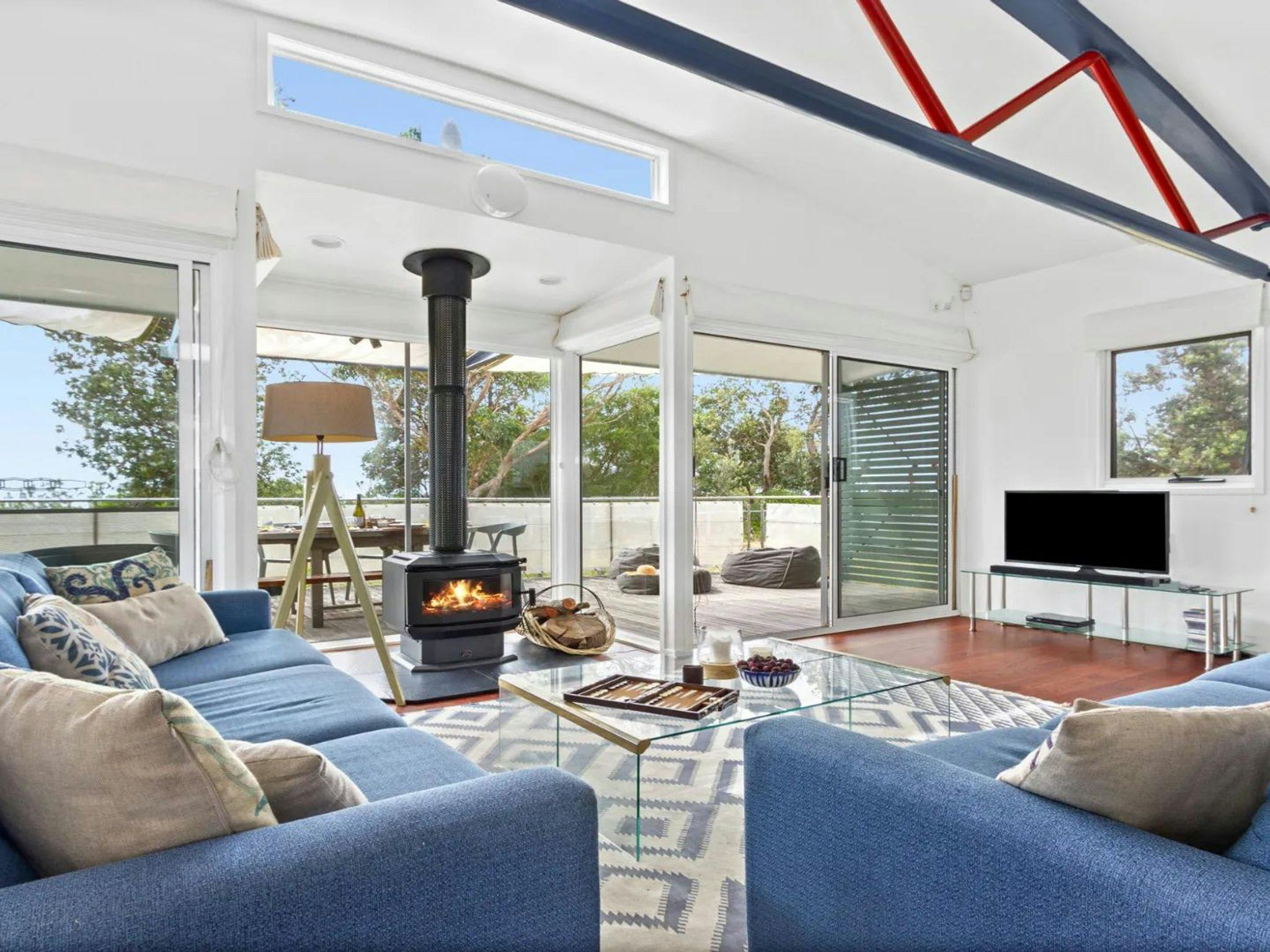 Polished timber floors, extensive use of glass and ocean backdrop combine to create the perfect beach home. The ground and first floors features a family room complete with two tri-bunks, flat screen television and DVD and two double bedrooms opening on to a private courtyard. The main bathroom on the second floor is spacious and has an en suite with sunken bath and private balcony. The top level comprises a large living, kitchen and dining area which opens up so you can dine alfresco on the large terrace in the winter months you can snuggle up in front of the Vista Stack Wood burner. Climb the stairs to the observation deck and take in the fabulous views of the ocean.