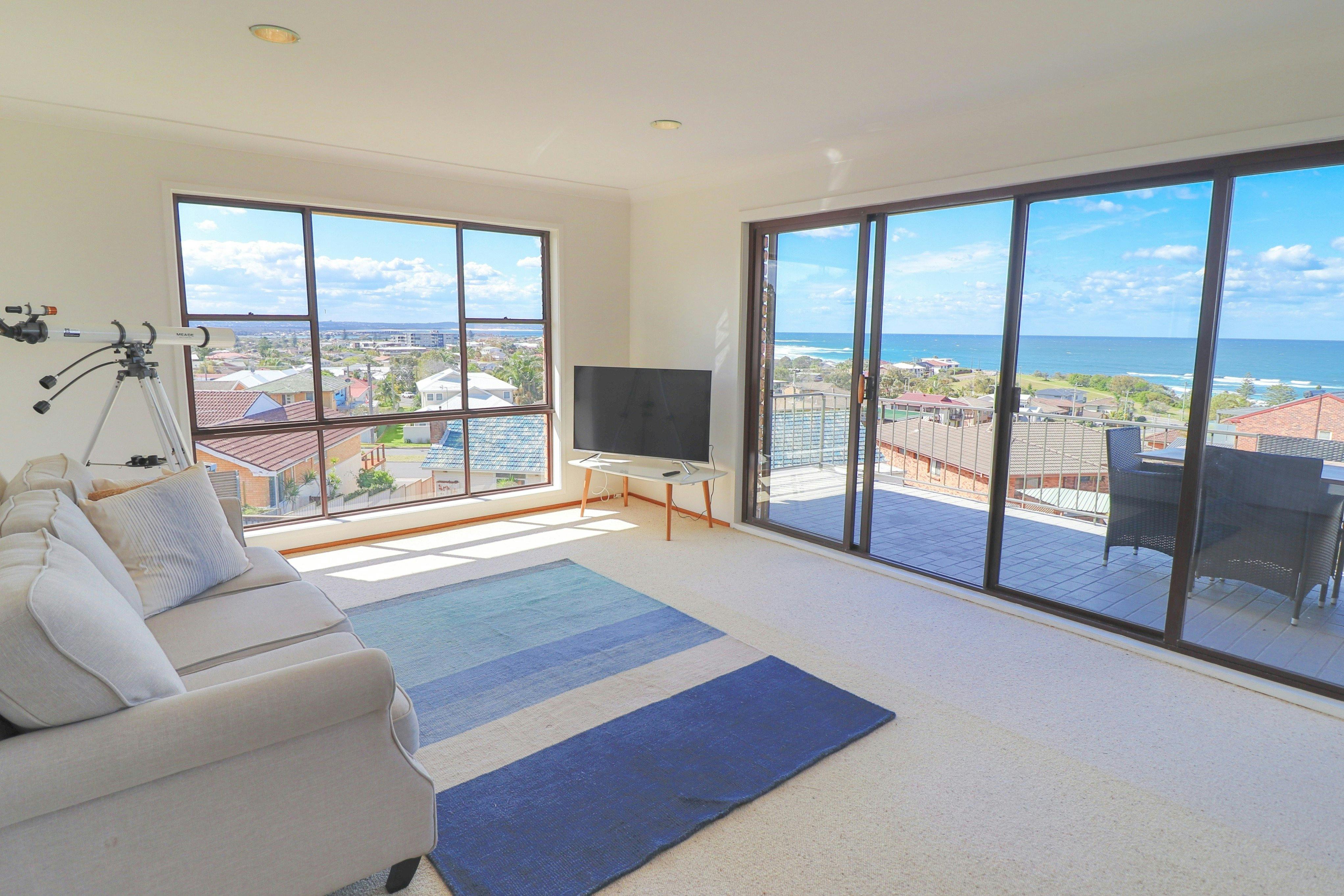 With amazing panoramic views of the Pacific Ocean and Lake Macquarie, this three-bedroom home is perfect for a family getaway by the beach.