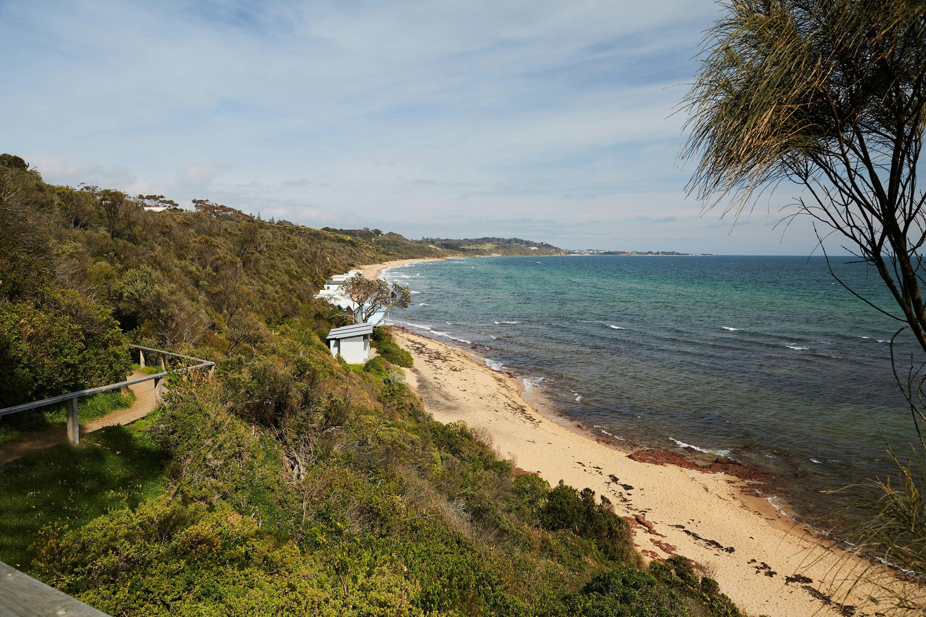 This quiet family beach stretching over 1.5 kilometres is a favourite with locals. Colourful bathing boxes line sections of the sandy beach.