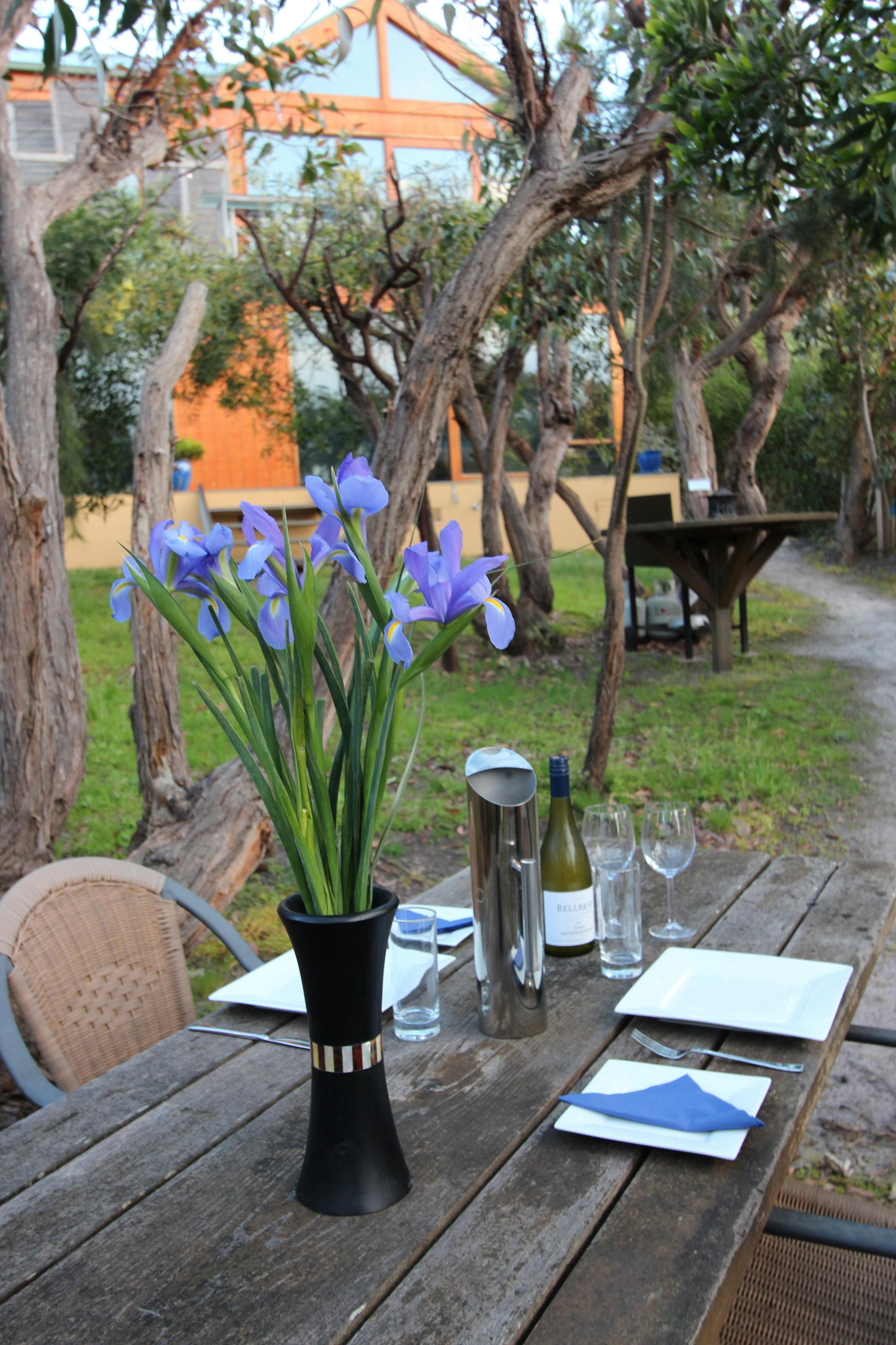 Campers' Cabin and Gazebo: This fun and funky hideaway with its own Love Swing, outdoor furniture and barbecue has been designed for those who love champagne on a beer budget. Two pavilions provide a comfortable double bedroom, bathroom and kitchenette with views across the Inlet to the Lighthouse and ocean.