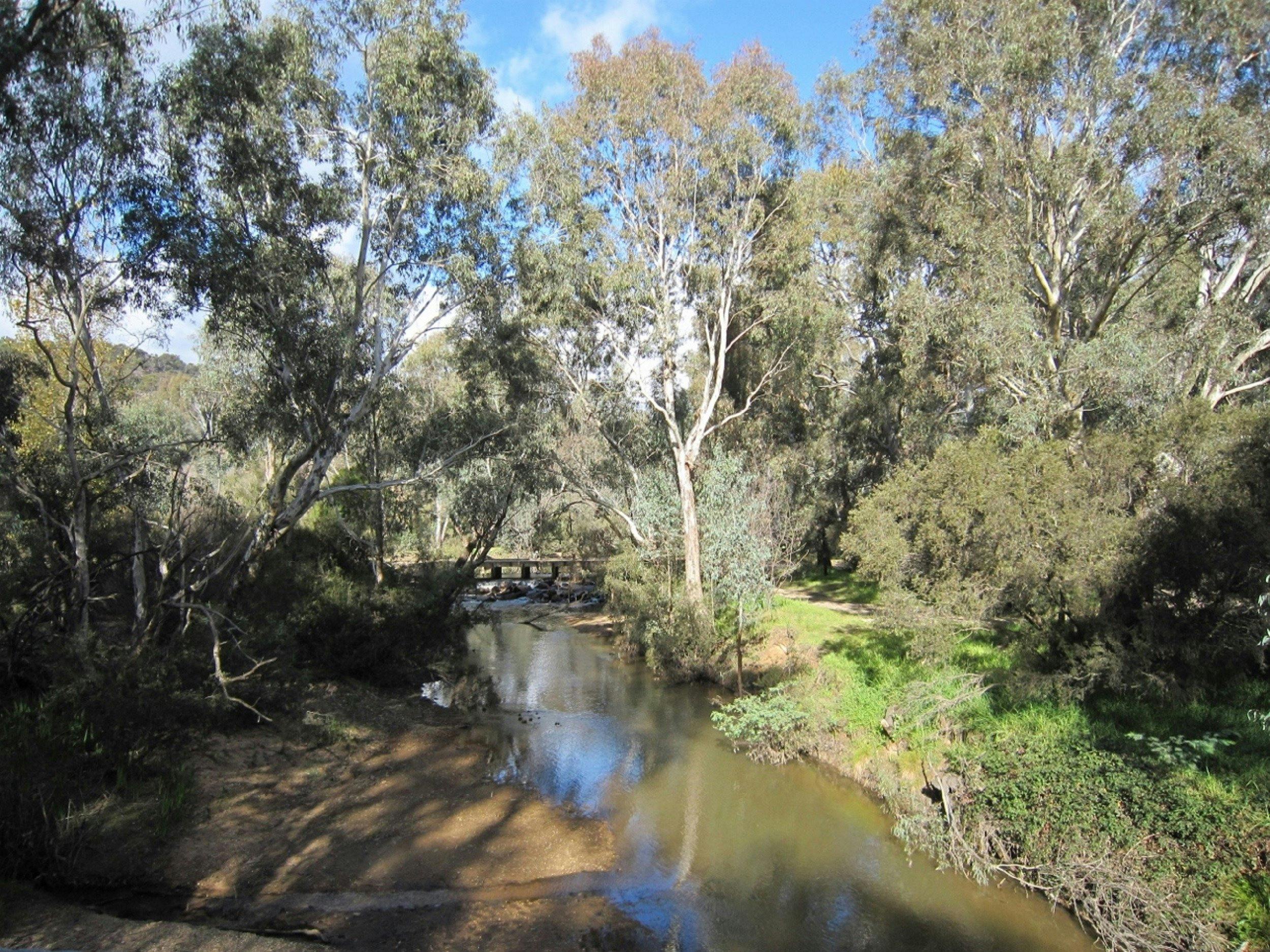 The track leads down to Reedy Creek and follows it upstream to a suspension bridge over the creek.