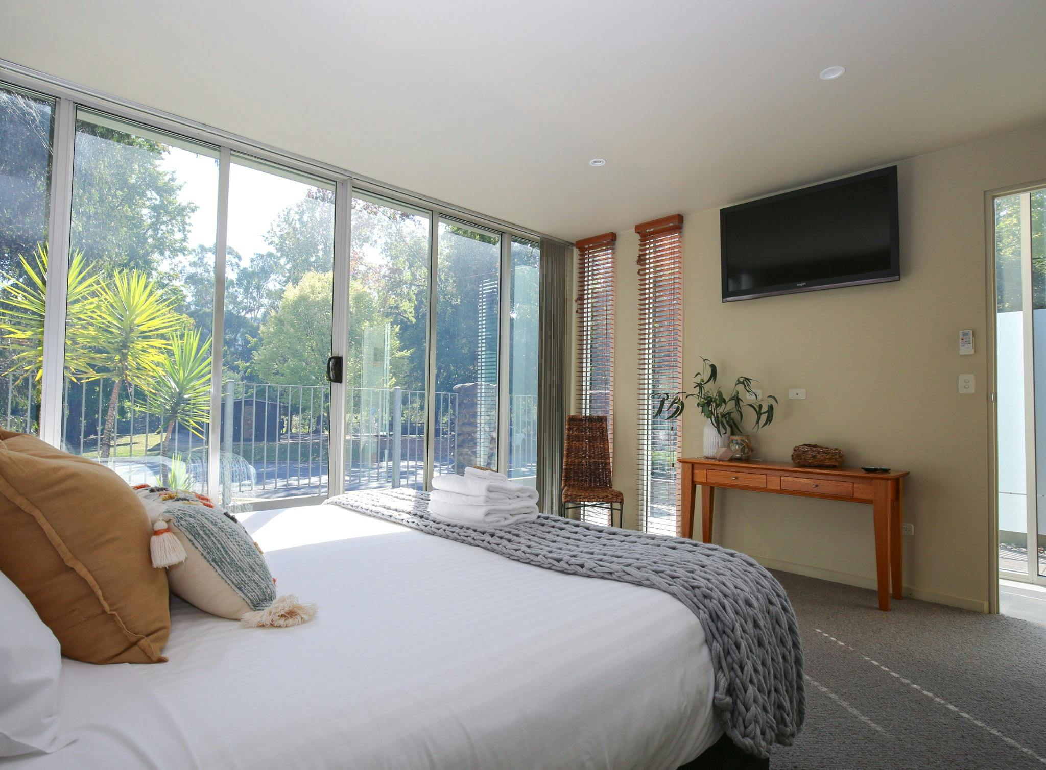 Your gourmet kitchen featuring Miele appliances overlooks your living and dining and is perfect to sample local produce or whip up a special breakfast - but you have Bright's best cafes and restaurants at your doorstep so you may just use it to chill the champagne. On the lower entrance level, two luxurious bedrooms offer the perfect place to relax after a long day exploring. The master bedroom with queen bed offers access to your terrace with floor to ceiling glass. Cosy up and enjoy a movie on your large flat screen television or truly unwind in the corner spa of your private ensuite. A dressing room/robe adds to the luxury of your private retreat. The second beautiful bedroom also featuring a queen bed offers an enclosed television with all bedding and linen included. The main bathroom is downstairs and includes a neatly hidden away laundry with washing machine, dryer and indoor hanging area.