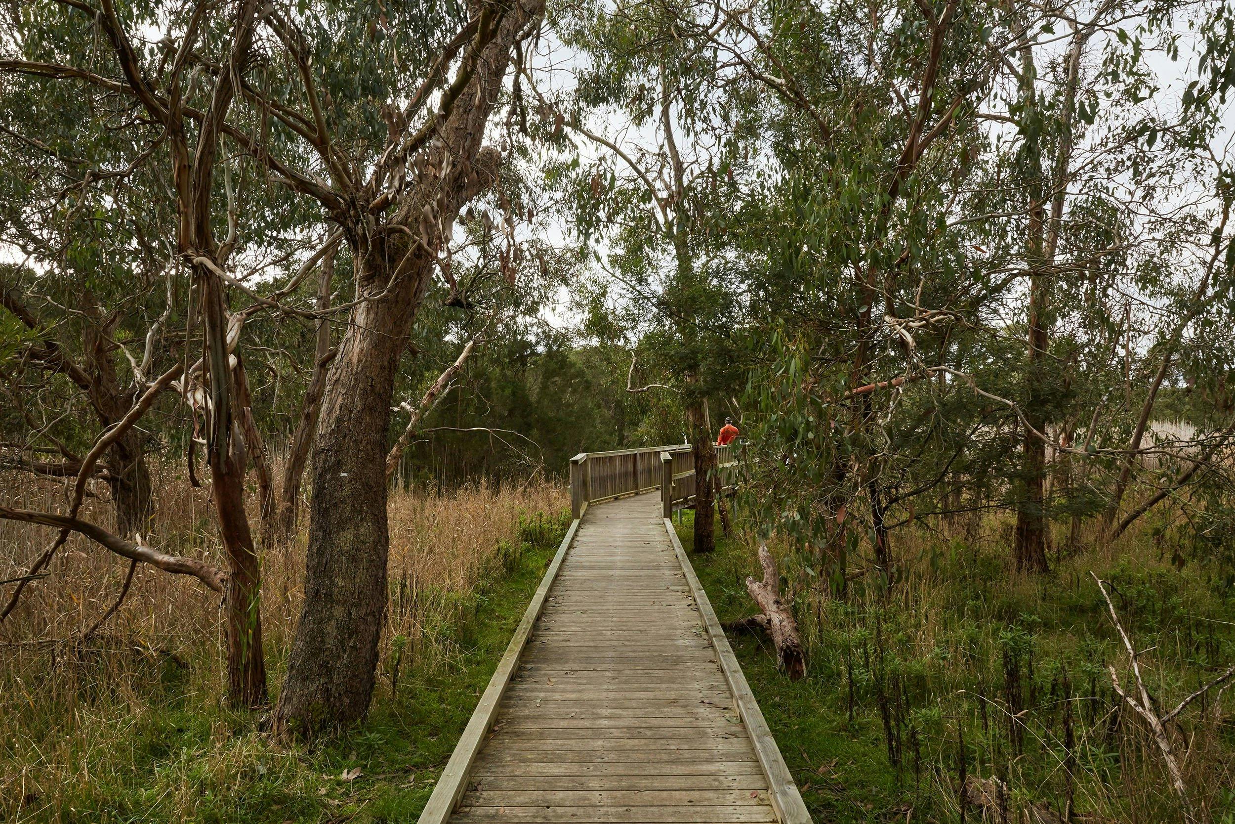 The Woodland Walk commences at the gate on the western side of the Visitor Centre and lead across Stockleys Creek to the Balcombe Creek ford and bridge. This 2 km path meanders through high quality Manna and Swamp Gum woodland and then more open country where cattle once grazed. Koalas, wallabies, kangaroos and other wildlife may be spotted. At the end of the Woodland Walk the path arrives at the Wetlands Viewpoint. From here walkers can continue on the Kur-Bur-Rer Walk, or return to the Visitor Centre via the Tichin-Goroke Link that leads back to the Visitor Centre via the Wetlands Walk.