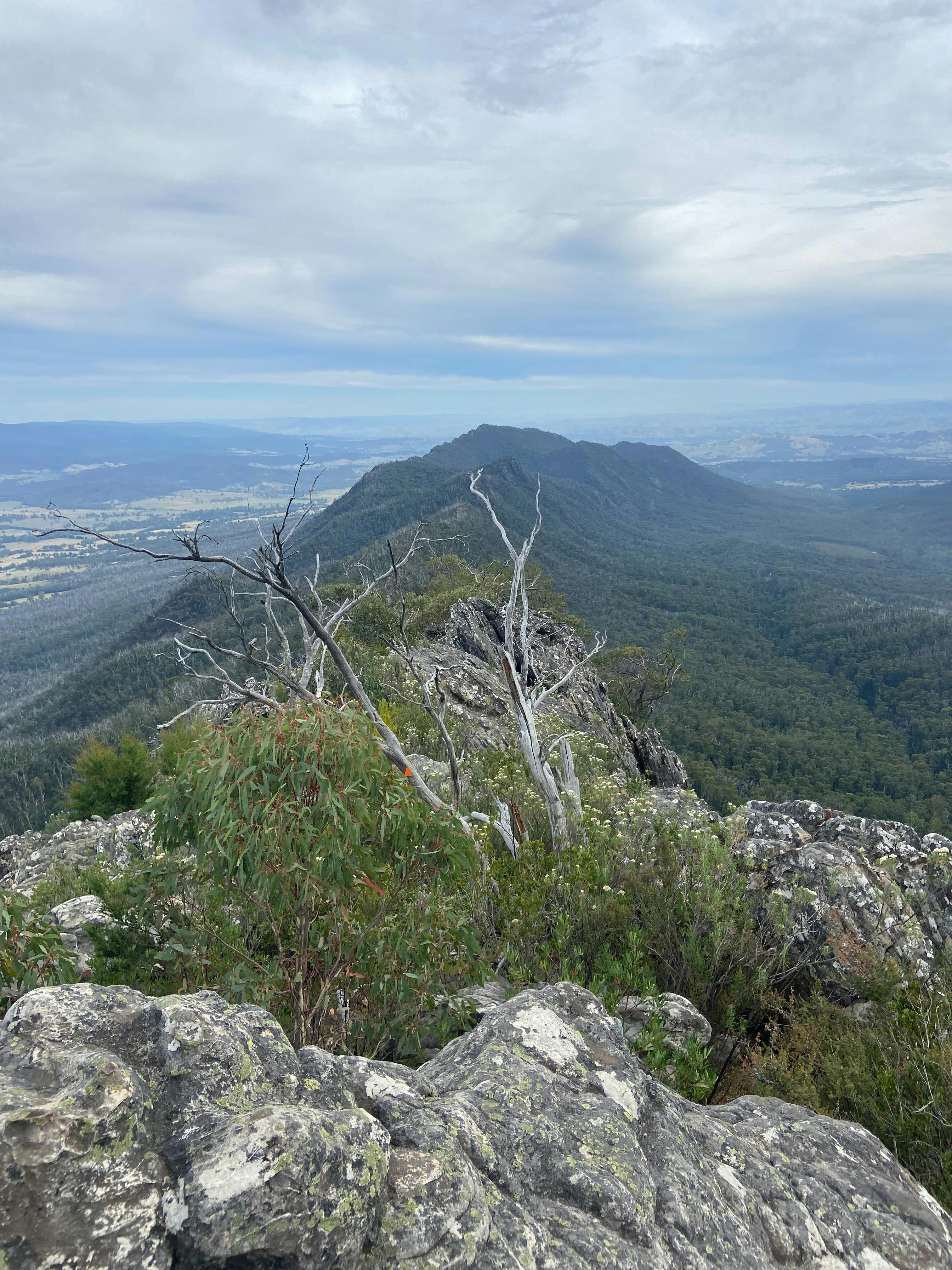 This grade 5 hike is extremely difficult and is suitable for very experienced bushwalkers only. It climbs 550m north from Sugarloaf Saddle Day Visitor Area to Sugarloaf Peak, the highest point on the range and is a challenging approach. The route involves short sections of free climbing, up near-vertical rock faces, which is not recommended for small children.