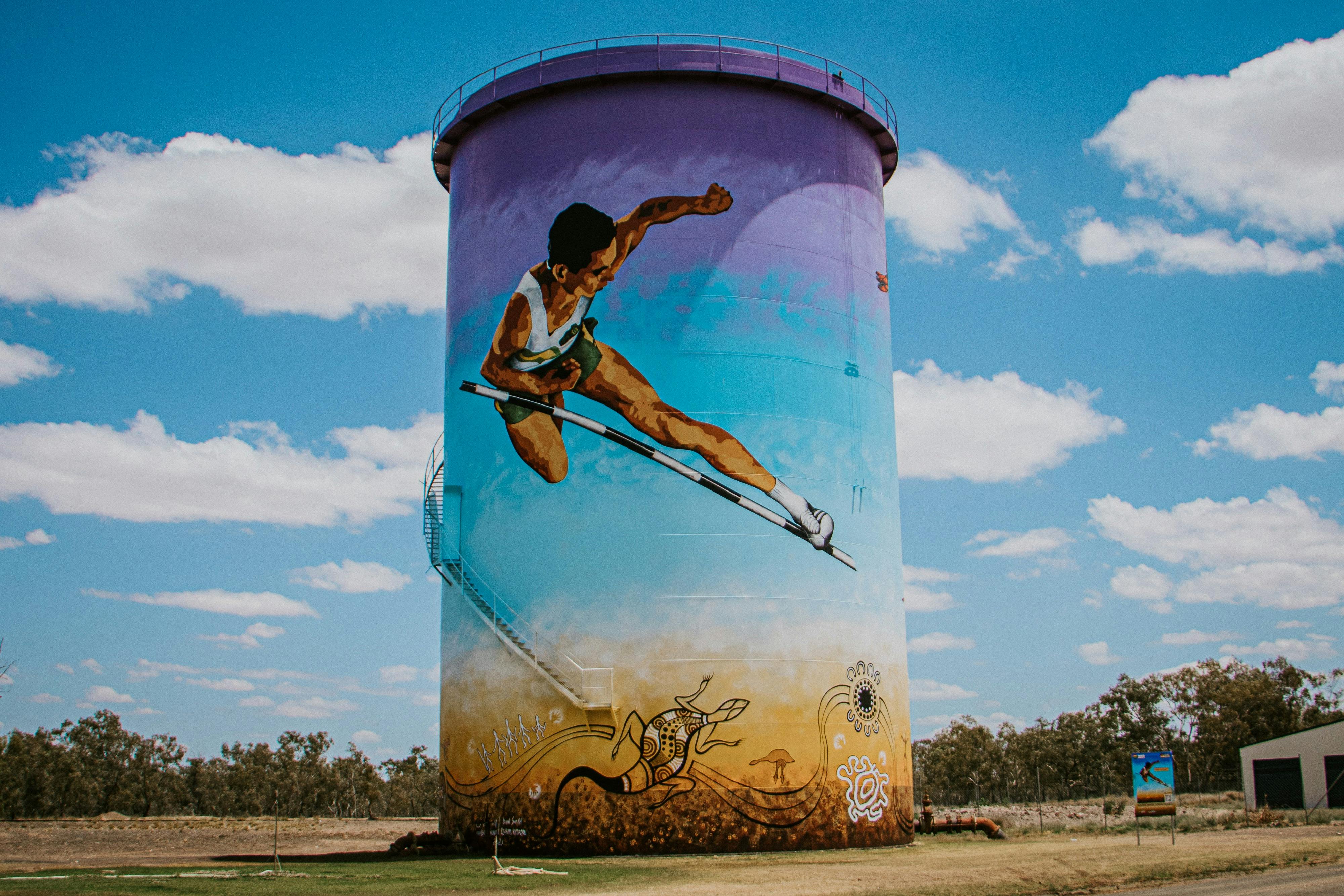 As a finishing touch, the Bourke community added their hand prints to the bottom of the mural. The mural honours Bourke’s Commonwealth gold medallist, showing Percy Hobson clearing the high jump bar with Red-tailed Black cockatoos on the other side of the tank.