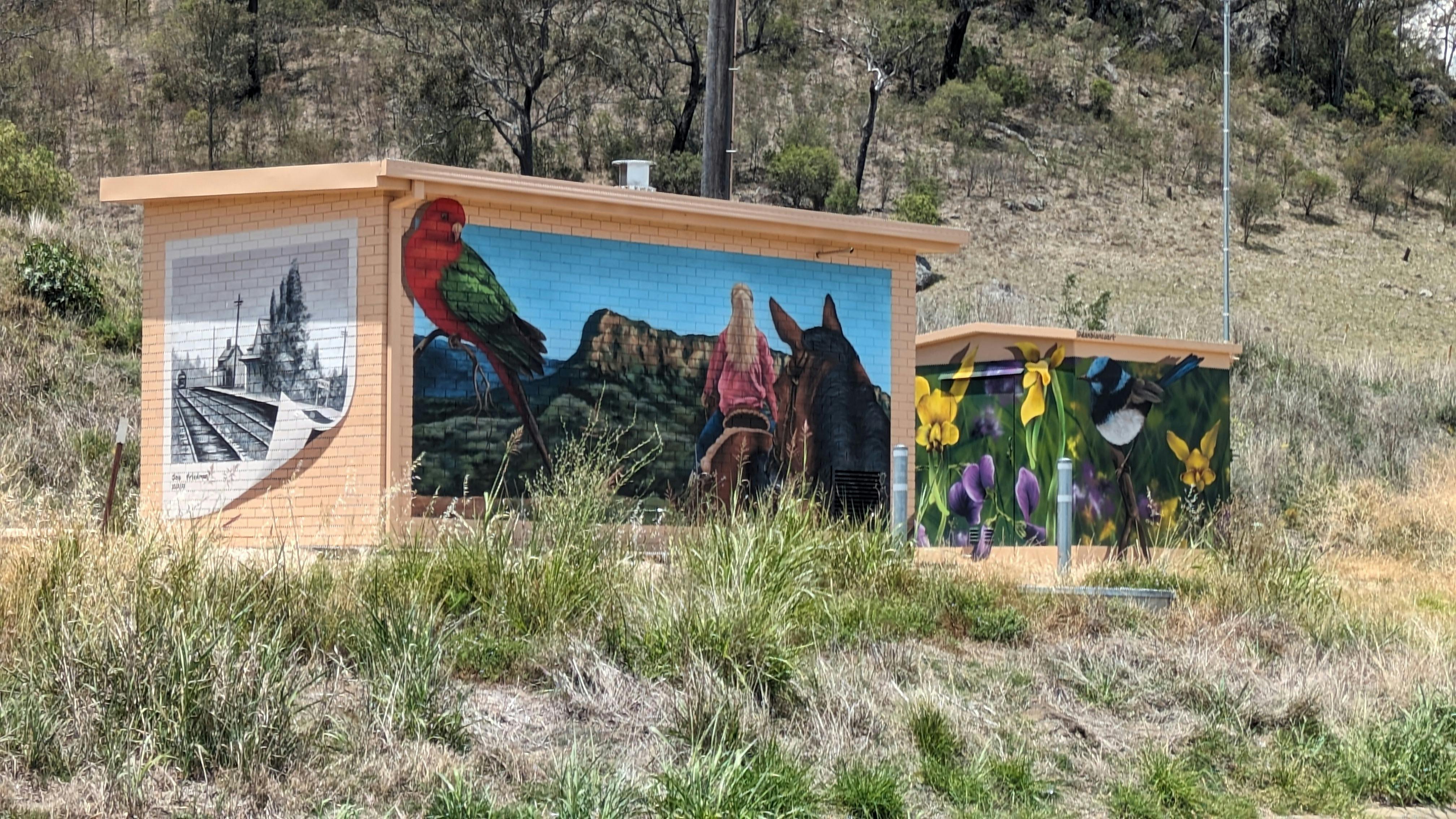 As you journey towards Murrurundi from Muswellbrook, the scenic route unveils vibrant murals on signal stations along the railway line. In Wingen, New South Wales, the Australian Rail Track Corporation (ARTC) organised a striking mural on the Hunter Valley Network railway’s signal and communications box.